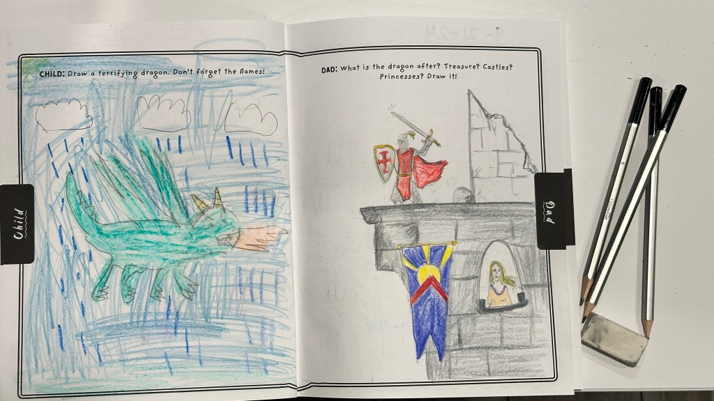 Since my daughter was really into drawing, I wanted to encourage her to practice and expand her creativity. While looking into ways to do this, I found this book – where there’s a prompt for her to draw something then a prompt for me to draw something to build on her drawing. I really enjoy this collaborative drawing and it does encourage me to get my sketching goals done because it makes her happy and I think it’s creating cherished memories she’ll carry with her into her artistic endeavors in the future.